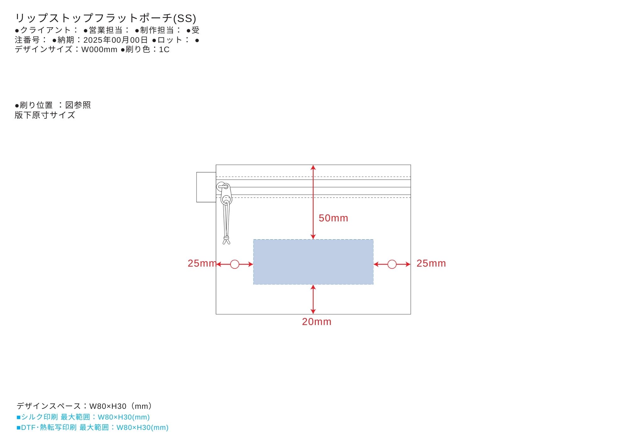 お見積書の備考に記載されたサイズの範囲で名入れデータを作成いただき、完全データでお送り下さい。原則一色ですが、印刷色はお好きなカラーが選べます。データの入稿先は、お見積り書の本文にてお知らせいたします。