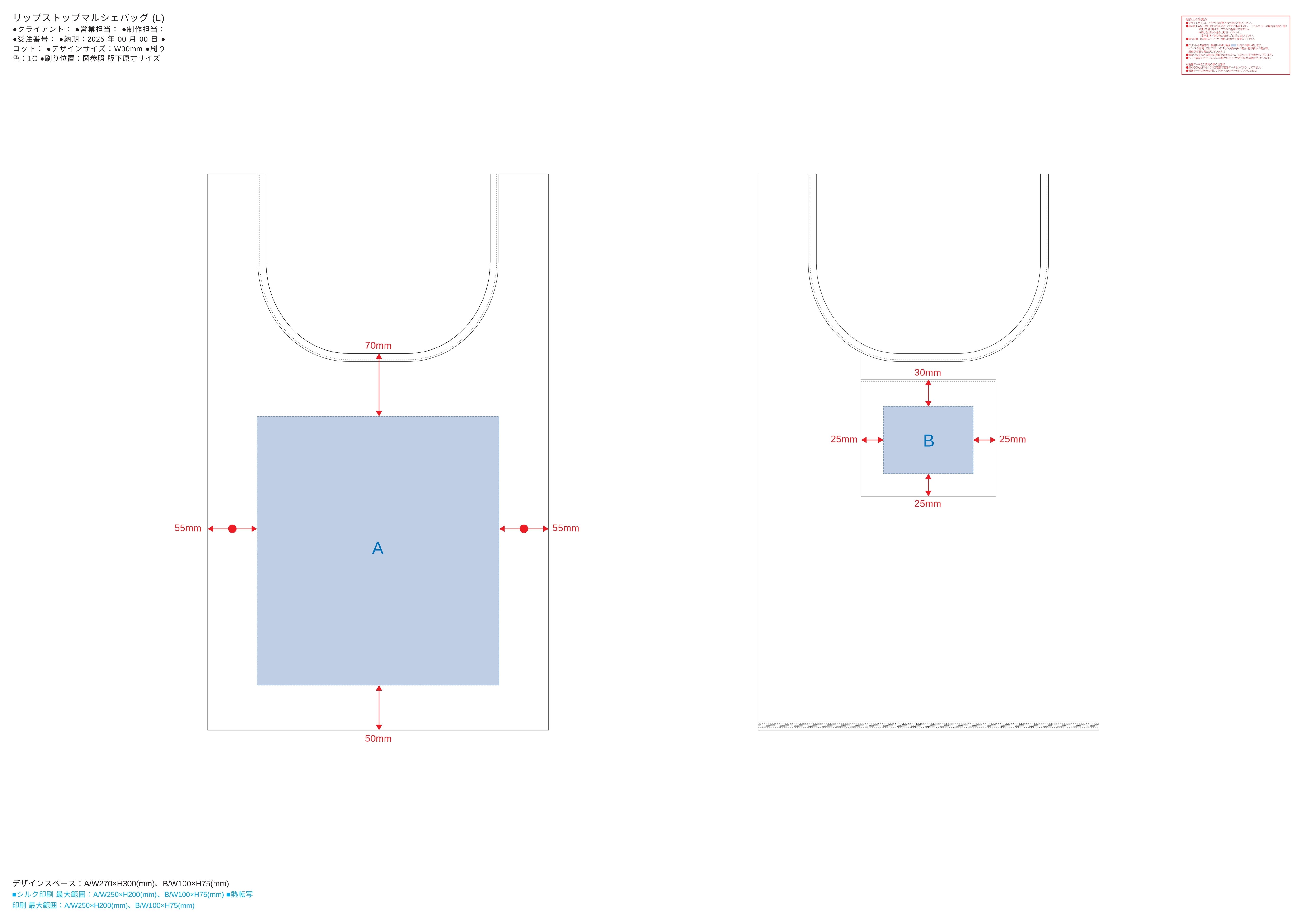お見積書の備考に記載されたサイズの範囲で名入れデータを作成いただき、完全データでお送り下さい。原則一色ですが、印刷色はお好きなカラーが選べます。データの入稿先は、お見積り書の本文にてお知らせいたします。