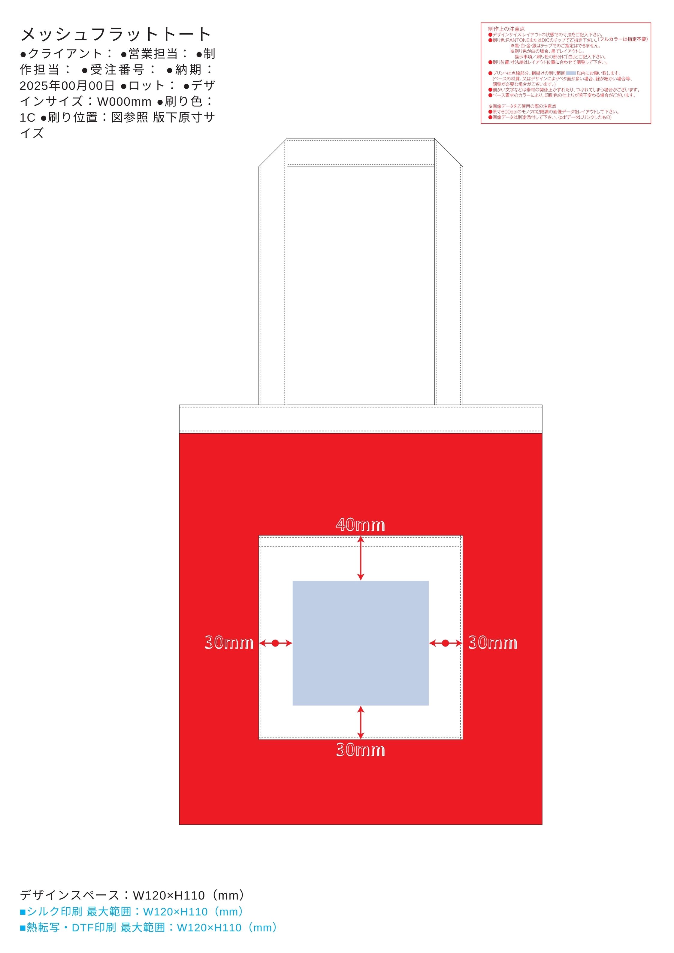 特徴/備考:メッシュ素材がポイントのフラットトートバッグです。口元テープ使いでフラットながらしっかりとした作りで、A4が入るサイズ感なので、書類などをいれるサブバッグとしてもおすすめです。またフロントポケットは小物入れとしてもぴったりで、デザインのアクセントにもなっています。外ポケット部分に名入れ可能で、単色印刷はもちろん、フルカラー印刷にも対応しています。 [フルカラー印刷] [スピード印刷] [新作商品.]