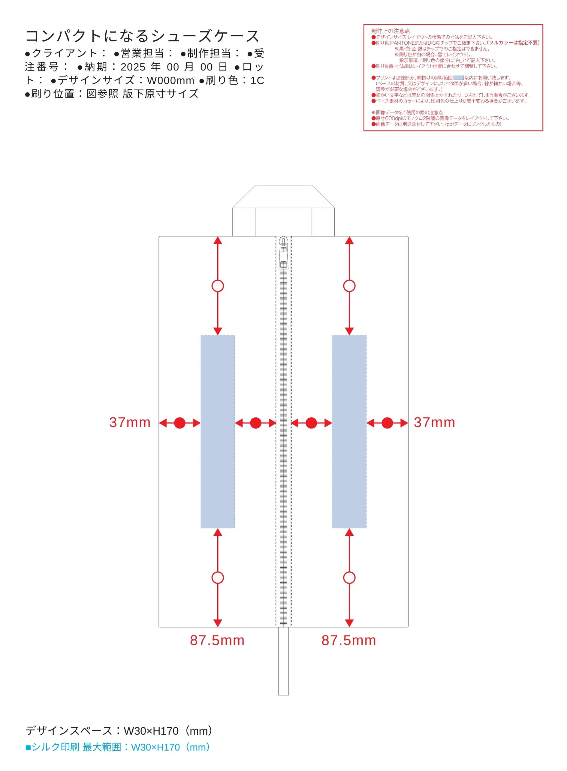 お見積書の備考に記載されたサイズの範囲で名入れデータを作成いただき、完全データでお送り下さい。原則一色ですが、印刷色はお好きなカラーが選べます。データの入稿先は、お見積り書の本文にてお知らせいたします。