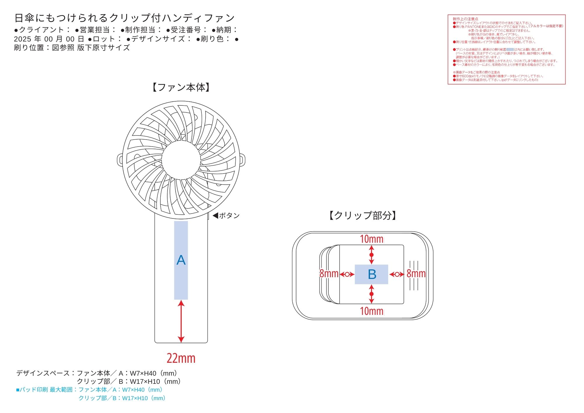 特徴/備考:クリップ付きで日傘にも取り付けられるハンディファンです。日傘の中骨部分や、カバンやリュックにも付属のクリップで取り付けることができ、お出かけの際に手に持たずに涼むことができます。またクリップ部分を利用して卓上ファンとして使用することもできるためデスクワークの際にも便利です。コンパクトで持ち歩きやすいうえ、風量は弱・中・強の3段階調整が可能なので使用シーンやお好みで切り替えてご使用いただけます。またファン部分は動かして向きを変えることもできます。ファンの持ち手部分とクリップ部分に名入れが可能なので、お店の購入特典やキャラクター物販などのご提案がおすすめです。取説付(紙箱面、紙)、Type-Cケーブル付属(1000mm)、バッテリー容量2000mAh [スピード印刷] [新作商品.]