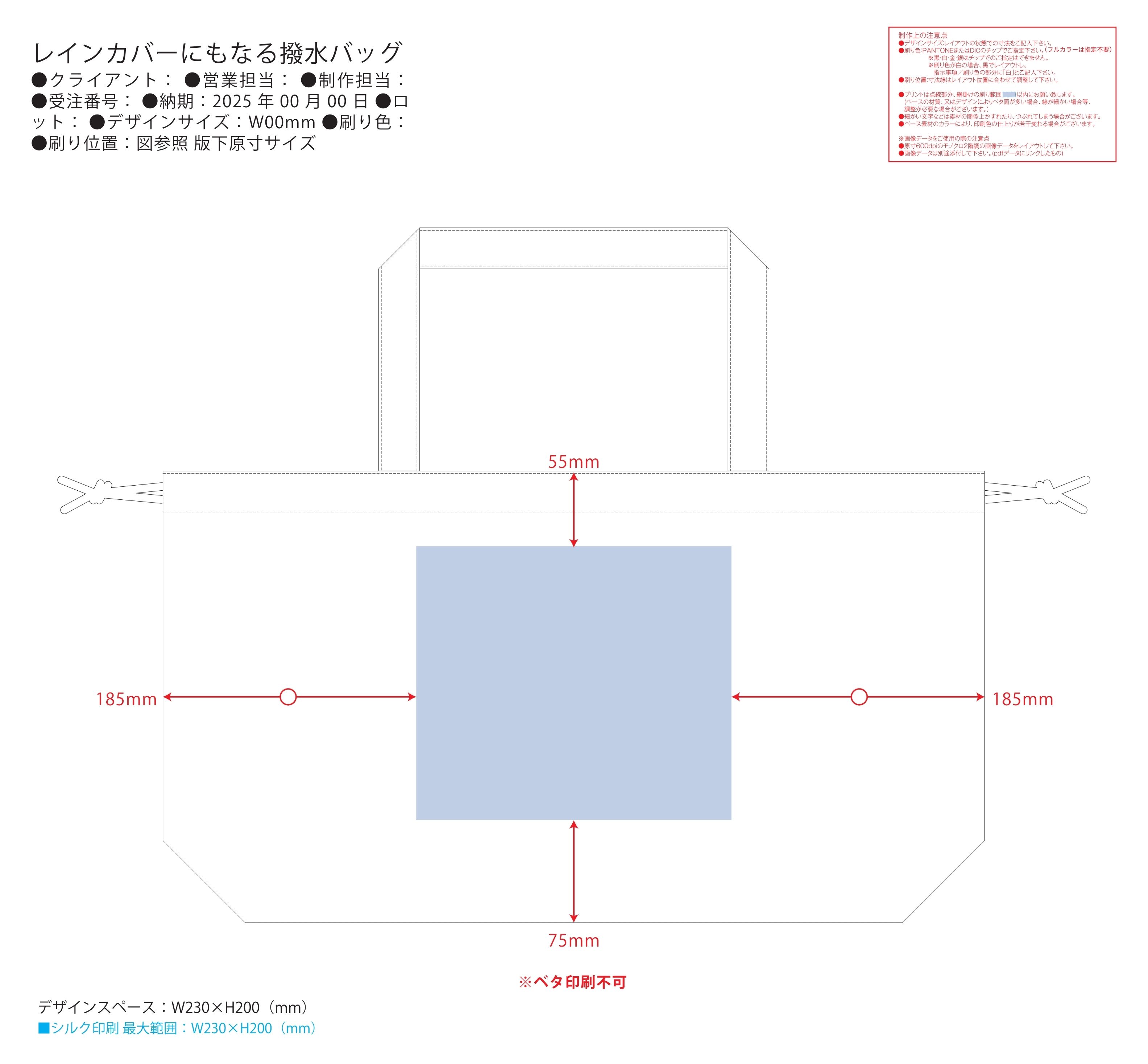 特徴/備考:撥水生地を使用した雨の日にぴったりなバッグです。撥水等級3級で水弾きがよく、薄手でしなやかな生地を使用しています。バッグの上から被せてレインカバーとして使用すれば、革製のカバンなどを雨から守ってくれます。さらにエコバッグとしても使える2WAYタイプです。折りたたむとコンパクトになり、いつでも持ち歩ける便利なサイズ感です。単色で名入れが可能なので、ブランドロゴなどを入れればオリジナルのレイングッズをご製作いただけます。 [スピード印刷] [新作商品.]