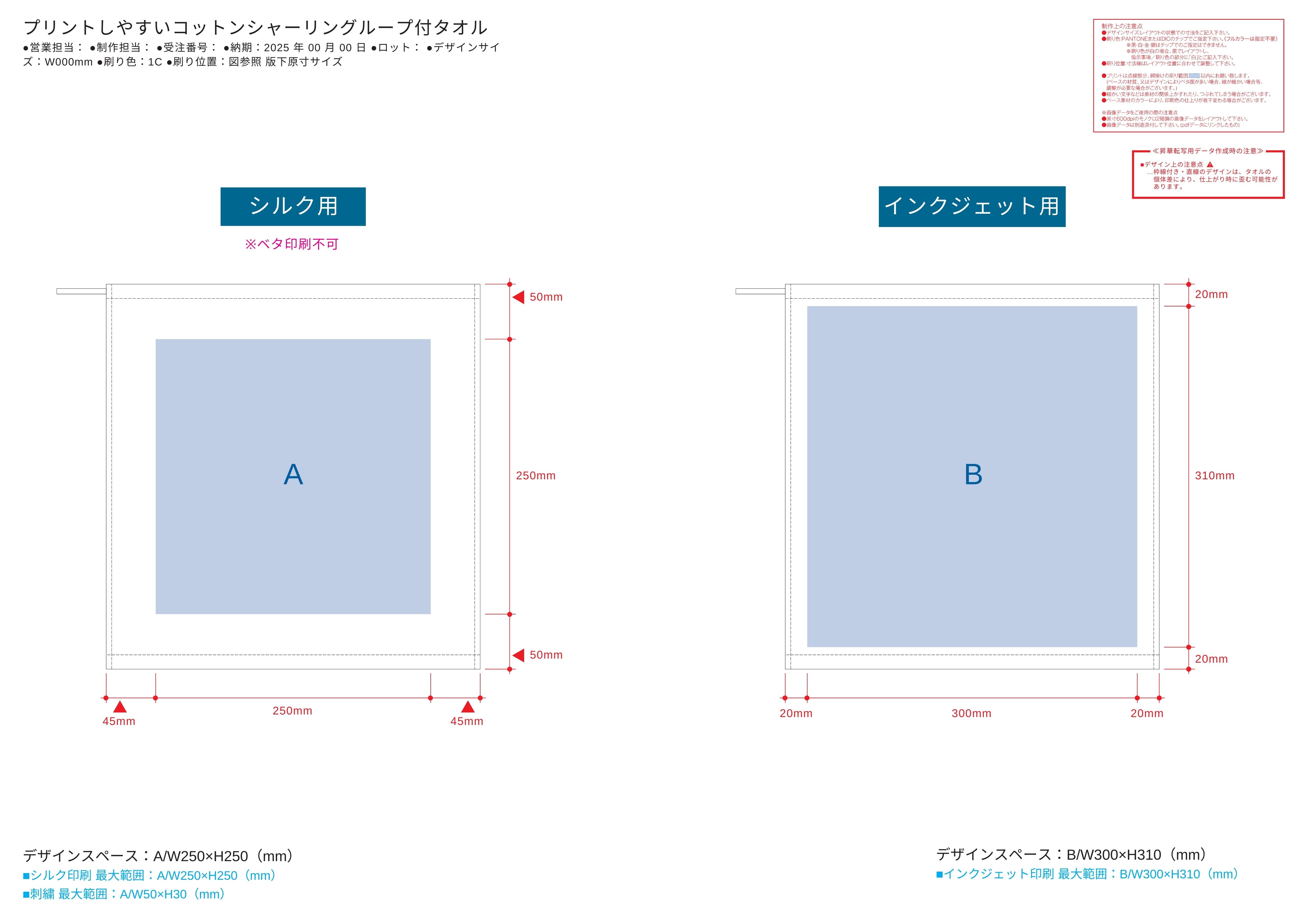 お見積書の備考に記載されたサイズの範囲で名入れデータを作成いただき、完全データでお送り下さい。原則一色ですが、印刷色はお好きなカラーが選べます。データの入稿先は、お見積り書の本文にてお知らせいたします。