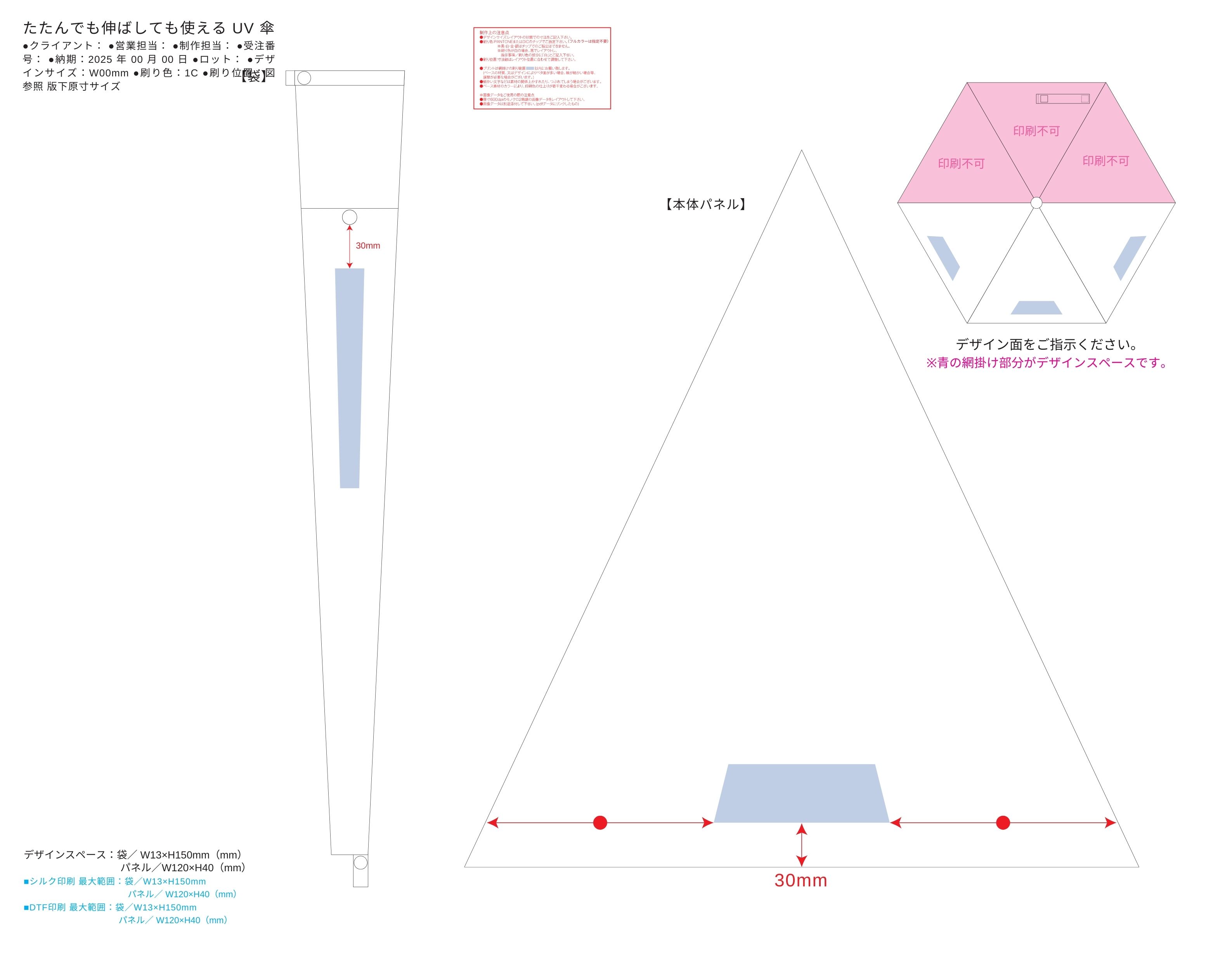 特徴/備考:たたんでも伸ばしても使える便利なUV傘です。2段傘仕様で、スナップボタンが付いているためカバンに入れる際はたたんで、雨傘として使用したあとは伸ばしたまま手をあまり濡らさずに袋にしまうことができます。どちらの状態でも留めやすいよう、ベルトにはスナップボタンが2つ付いています。傘袋の底には穴が空いており、濡れたまましまう場合も袋に水がたまりません。さらにUVカット100%以上の生地を使用しており、晴雨兼用として実用性もばっちりです。傘パネルはもちろん、傘袋にも名入れ可能なため傘袋に名入れすればしまっている状態でも販促効果が期待できます。取説付、ネイルガード付 [フルカラー印刷] [スピード印刷] [新作商品.]