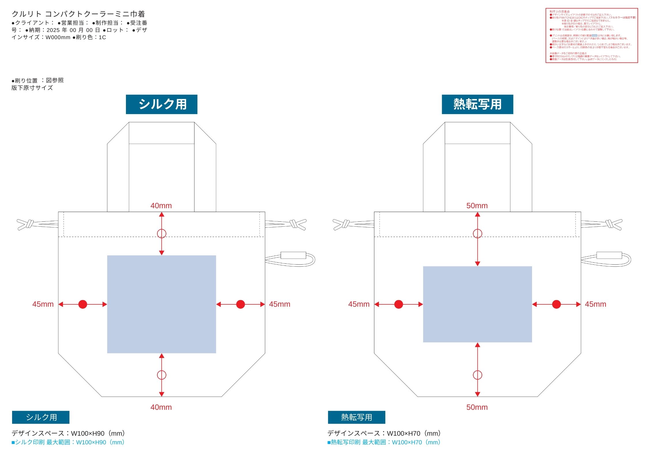 お見積書の備考に記載されたサイズの範囲で名入れデータを作成いただき、完全データでお送り下さい。原則一色ですが、印刷色はお好きなカラーが選べます。データの入稿先は、お見積り書の本文にてお知らせいたします。