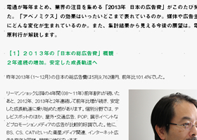 電通が毎年まとめ、業界の注目を集める「2013年 日本の広告費」がこのたび発表されました。「アベノミクス」の効果はいったいどこまで表れているのか。媒体や広告主の業種ごとにどんな変化が生まれているのか。また、集計...