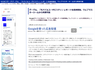 Googleがモバイル対応のユーザビリティの診断レポートを提供開始。ウェブマスターツールから利用出来る。ユーザビリティ上の問題点を指摘してくれる。無料。米Googleは2014年10月29日、Webサイトがモバイルユーザー...