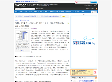マイボイスコム株式会社は、『秋の行楽』に関するインターネット調査を2014年10月1日~5日に実施し、11587件の回答を集めた。調査の結果、今秋、行楽やレジャーに行った・行く予定がある人は5割弱で、そのうち...