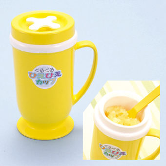 冷凍庫で冷やしたカップに飲み物を入れてかき混ぜるだけでシャーベットが作れます。取説