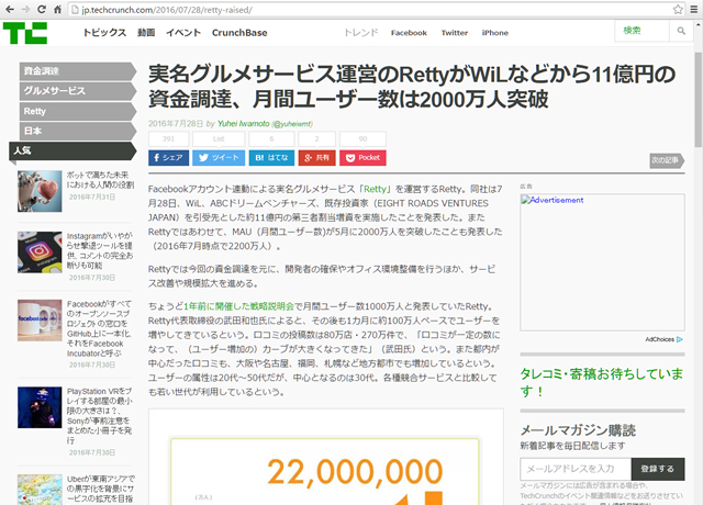 Facebookアカウント連動による実名グルメサービス「Retty」を運営するRetty。同社は7月28日、WiL、ABCドリームベンチャーズ、既存投資家(EIGHT ROADS VENTURES JAPAN)を引受先とした約11億円の第三者割当増資を実施した...