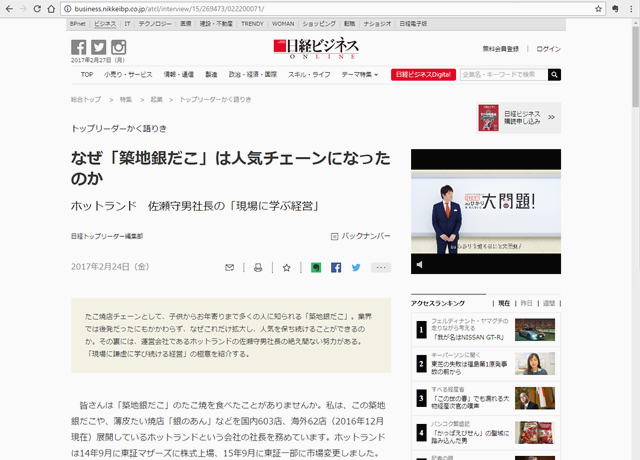 ホットランド 佐瀬守男社長の「現場に学ぶ経営」 たこ焼店チェーンとして、子供からお年寄りまで多くの人に知られる「築地銀だこ」。業界では後発だったにもかかわらず、なぜこれだけ拡大し、人気を保ち続けることができるのか。その裏には、運営...