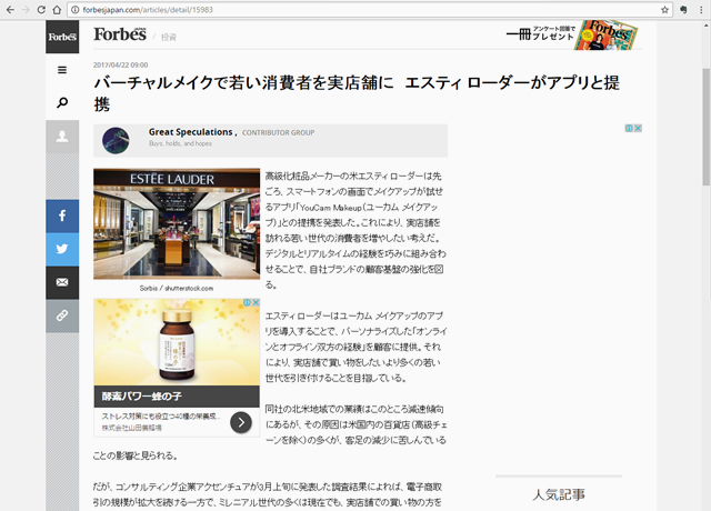 高級化粧品メーカーの米エスティ ローダーは先ごろ、スマートフォンの画面でメイクアップが試せるアプリ「YouCam Makeup(ユーカム メイクアップ)」との提携を発表した。これにより、実店舗を訪れる若い世代の消費者を増やしたい考えだ。デジタル...