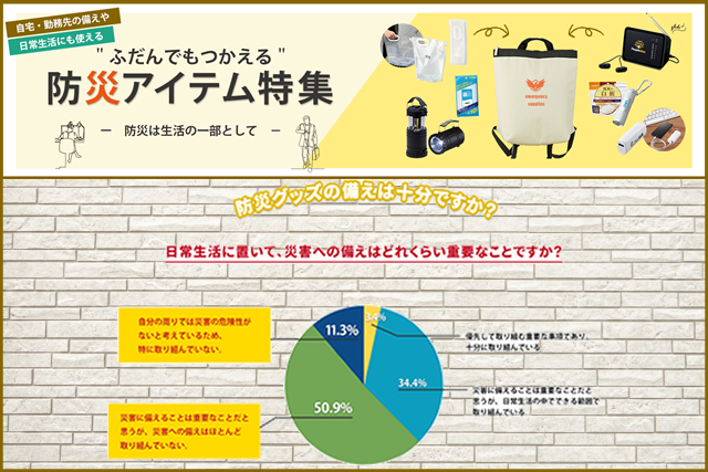 地震や大雨など異常気象が毎年のように発生し日本では常に防災対策が必要となっています。販促ノベルティ卸売りセンターでは“ふだんでもつかえる”をコンセプトにいざという時に必要なグッズを多数ご紹介します。
