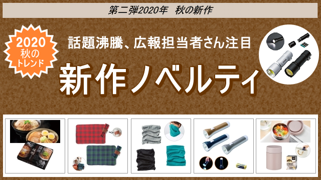 2020年秋の第二弾新作ノベルティはカラフルなブランケットやボトル、食品も冬に喜ばれる温かいものが新入荷!引き続き防災、ウイルス対策商品も新商品が入荷しています。秋からの本格的な販促にお役立てください。