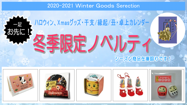 毎年恒例の[期間限定] 冬ノベルティのお取り扱いが、今年も始まりました。卓上カレンダーをはじめ、クリスマスや干支縁起グッズを多数ご紹介!ボーナス商戦や年末年始商戦など、冬の集客販促にぜひご検討下さい。