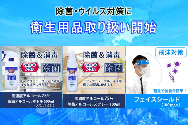 本日は、期間限定商品「除菌アルコールスプレー」2アイテムと「フェイスシールド」、お取扱開始のご案内です。在庫がなくなり次第の終了となるため、お早めのご検討をオススメしております。
