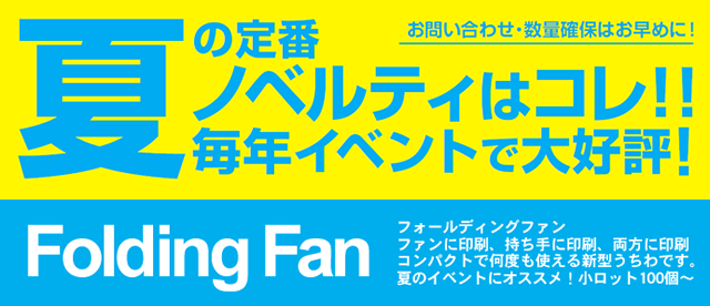 [期間限定] 夏ノベルティのお取り扱いが、今年も始まりました。「扇風機」「扇子」をはじめ、クールなアイテムを専門カテゴリにて多数ご案内。ボーナス商戦やレジャーなど、2020年も夏の集客販促にぜひご検討下さい。