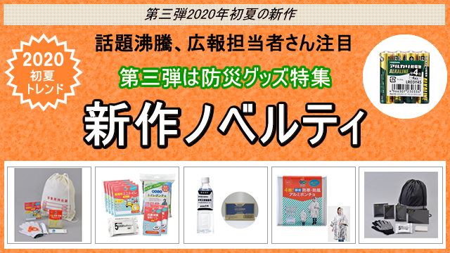 2020年初夏の新作第三弾は、防災グッズ新作です。今防災に対する注目が高まっています。備えておきたい防災グッズ、保存食を新商品からご紹介!ノベルティだけでなく、企業や家庭の備蓄品としてもぜひご提案ください。