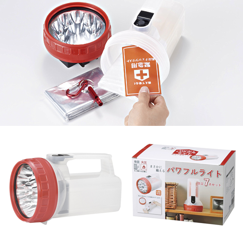 商品説明ページで伝え切れないノベルティ素材の細かな特徴を、スタッフが実際に手に取りレポートいたします。本日ご紹介する名入れ対応アイテムは「まさかに備えるパワフルライト 防災7点セット」。