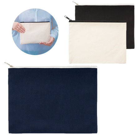 商品説明ページで伝え切れないノベルティ素材の細かな特徴を、スタッフが実際に手に取りレポートいたします。本日ご紹介する名入れ対応アイテムは「キャンバスフラットポーチ(L)」。