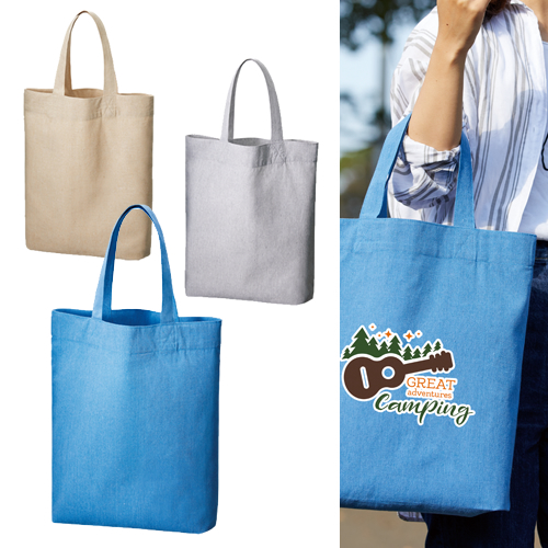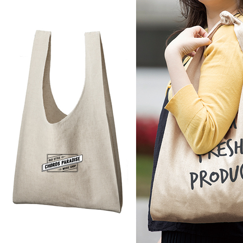 商品説明ページで伝え切れないノベルティ素材の細かな特徴を、スタッフが実際に手に取りレポートいたします。本日ご紹介する名入れ対応アイテムは「コットンリネンマルシェバッグ」。