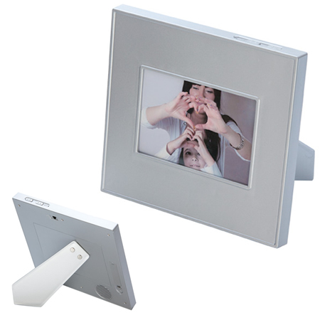 商品説明ページで伝え切れないノベルティ素材の細かな特徴を、スタッフが実際に手に取りレポートいたします。本日ご紹介する名入れ対応アイテムは「録音再生機能付きフォトフレーム シルバー」。