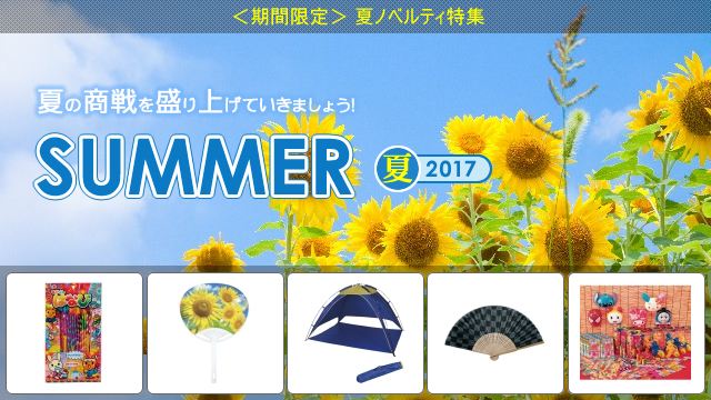 毎年恒例の[期間限定] 夏ノベルティのお取り扱いが、今年もいよいよ始まりました。「うちわ」「扇子」をはじめ、涼感グッズやイベントセットを専門カテゴリにて多数ご案内。2017年も、ボーナス商戦やレジャーなど、夏の集客販促にぜひご検討下さい。