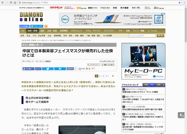 社長さんや店長さん、宣伝担当さん広報担当さんなど、ビジネスパーソンにオススメしたい今週の注目エントリーをご紹介/2016年12月12日版。トピック:中国で日本製美容フェイスマスクが爆売れした仕掛けとは