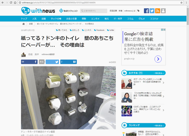 社長さんや店長さん、宣伝担当さん広報担当さんなど、ビジネスパーソンにオススメしたい今週の注目エントリーをご紹介/2016年12月19日版。トピック:紙ってる?ドンキのトイレ 壁のあちこちにペーパーが… その理由は