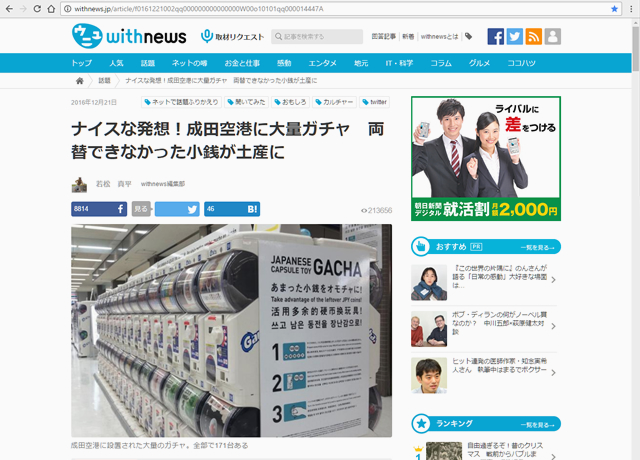 社長さんや店長さん、宣伝担当さん広報担当さんなど、ビジネスパーソンにオススメしたい今週の注目エントリーをご紹介/2016年12月19日版。トピック:ナイスな発想!成田空港に大量ガチャ 両替できなかった小銭が土産に