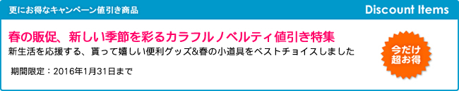 販促ノベルティ卸売りセンターでは、通常の卸売価格よりも更にお得な!値引きキャンペーンを期間限定で開催いたします。是非、お得なこの機会に名入れノベルティをご検討ください。皆様のご利用をお待ちしています。お得な期間は2016年1月15日まで。