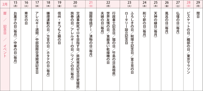 2016年2月の後半に実施される国民的イベントや記念日を調べてみました。企業、店舗、自治体の集客プロモーションや販促キャンペーンに記念日を活用しましょう。節分、立春、バレンタイン。春を告げるプロモーションで活性化を。