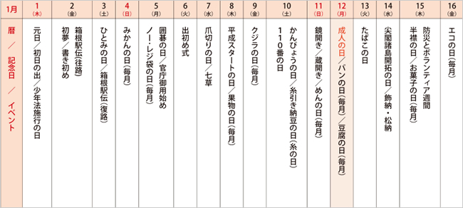 2016年1月の前半に実施される記念日や国民的イベントを調べてみました。企業、店舗、自治体などの集客プロモーションや販促キャンペーンに記念日を活用しましょう。正月、成人式、受験シーズン。寒さ深まる季節、冬の暮らしを応援!
