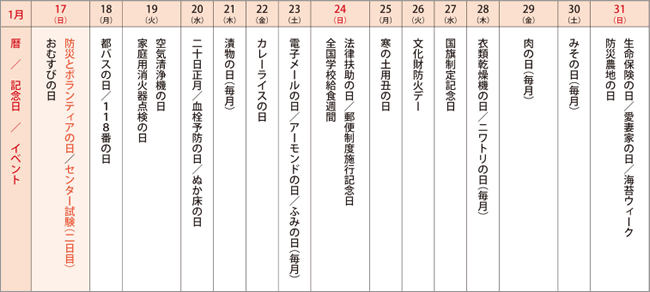 2016年1月の後半に実施される記念日や国民的イベントを調べてみました。企業、店舗、自治体などの集客プロモーションや販促キャンペーンに記念日を活用しましょう。正月、成人式、受験シーズン。寒さ深まる季節、冬の暮らしを応援しよう