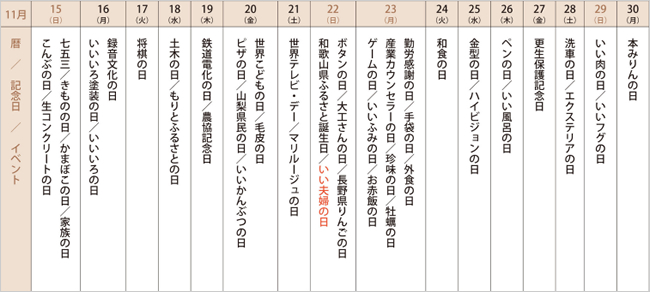 2015年11月の後半に実施される記念日や国民的イベントを調べてみました。企業、店舗、自治体などの集客プロモーションや販促キャンペーンに、記念日を活用しましょう。七五三、いい夫婦の日etc...家族の絆を深める販促シーンのいろいろ。
