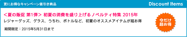 販促ノベルティ卸売りセンターでは、通常の卸売価格よりも更にお得な!値引きキャンペーンを期間限定で開催いたします。是非、お得なこの機会に名入れノベルティをご検討ください。皆様のご利用をお待ちしています。お得な期間は2015年5月31日まで。