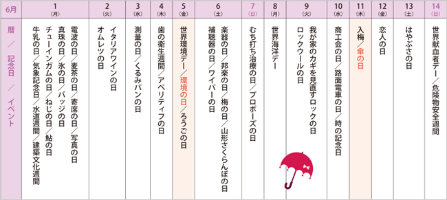 2015年6月の前半に実施される国民的イベントや記念日を調べてみました。企業、店舗、自治体の集客プロモーションや販促キャンペーンに記念日を活用しましょう。梅雨入り、衣替え、環境月間、ボーナス商戦を見据えて仕掛けづくり。