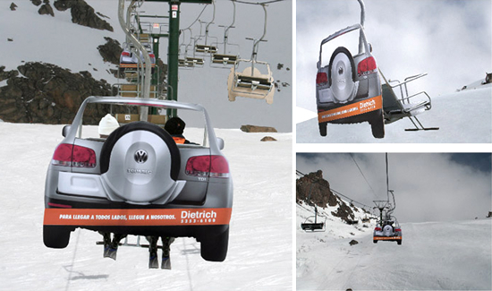 実用的な広告から、ネタっぽいものまで。面白いアイデアが盛り込まれたユニークな屋外広告を集めてみました。トピック:カーディーラー(dietrich)の屋外広告。スキーリフトで展開されたキャンペーンでフォルクスワーゲン・トゥアレグの4WD性能をPR。<アルゼンチン>