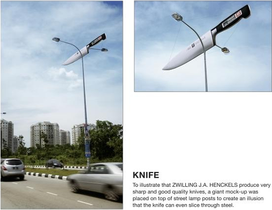 実用的な広告から、ネタっぽいものまで。面白いアイデアが盛り込まれたユニークな屋外広告を集めてみました。トピック:ナイフメーカー(Henckel Knive)の屋外広告。街路灯が見事に真っ二つ、優れた切れ味を見事に表現しています。<マレーシア>