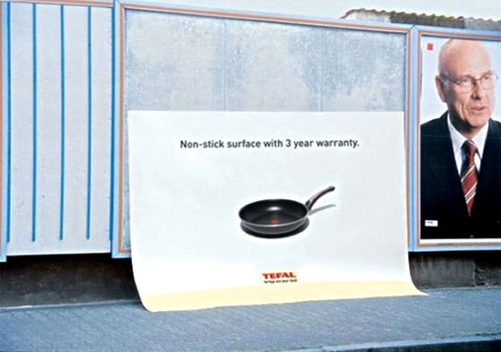 実用的な広告から、ネタっぽいものまで。面白いアイデアが盛り込まれたユニークな屋外広告を集めてみました。トピック:フライパン(Tefal)の屋外広告。壁に貼りつかない広告は、3年保証の「汚れが付かない」を上手く表現しています。<スロバキア>