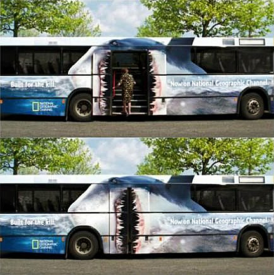 実用的な広告から、ネタっぽいものまで。面白いアイデアが盛り込まれたユニークな屋外広告を集めてみました。トピック:テレビ番組(ナショナルジオグラフィックチャンネル)のバス広告。これ以上ないほど強烈なインパクトで、巨大サメの恐怖を演出。<米国>