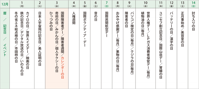 2014年12月の前半に実施される記念日や国民的イベントを調べてみました。企業、店舗、自治体などの集客プロモーションや販促キャンペーンに記念日を活用しましょう。クリスマス、お歳暮、年始の準備など、行事多彩な12月は積極的アプローチで。