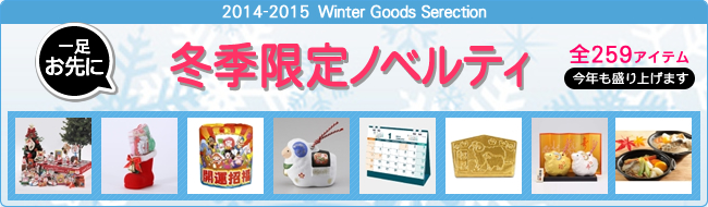 毎年恒例の冬季限定ノベルティのお取り扱いが、2014年もいよいよ始まりました。卓上カレンダーをはじめ、名入れ対応のクリスマスグッズや干支グッズなどを専門カテゴリにて多数ご案内しています。ボーナス商戦など冬の集客と販促に是非ご検討下さい。