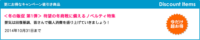 販促ノベルティ卸売りセンターでは、通常の卸売価格よりも更にお得な!値引きキャンペーンを期間限定で開催いたします。是非、お得なこの機会に名入れノベルティをご検討ください。皆様のご利用をお待ちしています。お得な期間は2014年10月31日まで。