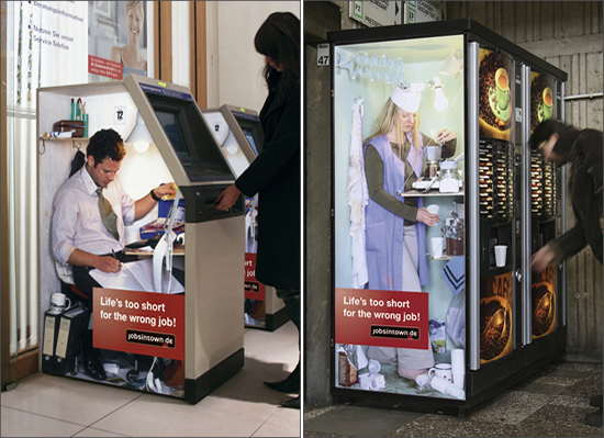 実用的な広告から、ネタっぽいものまで。面白いアイデアが盛り込まれたユニークな屋外広告を集めてみました。トピック:求人サイトの広告。現金自動支払機やコーヒー販売機の側面に貼られたシートで、人手不足を演出しているようです。<ドイツ>