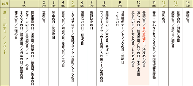 2014年10月の前半に実施される記念日や国民的イベントをまとめてみました。企業、店舗、自治体などの集客プロモーションや販促キャンペーンに、記念日をご活用しましょう。衣替え、運動会、レジャー・読書・食欲・芸術の秋。消費が動く時こそ集客UP。