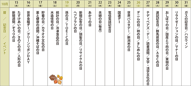 2014年10月の後半に実施される記念日や国民的イベントをまとめてみました。企業、店舗、自治体などの集客プロモーションや販促キャンペーンに、記念日をご活用しましょう。秋冬商戦開幕、衣替え、運動会、消費が動く時こそ集客アップのチャンス。