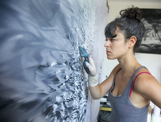 米国を中心に活躍する<Zaria Forman>という方の作風がユニークだと話題になっています。筆やブラシを使わずに自分自身の指だけで描くのだそうですが、主な題材の<気候変動をテーマとする風景画>の数々は、特に美しい仕上がりに思えます。