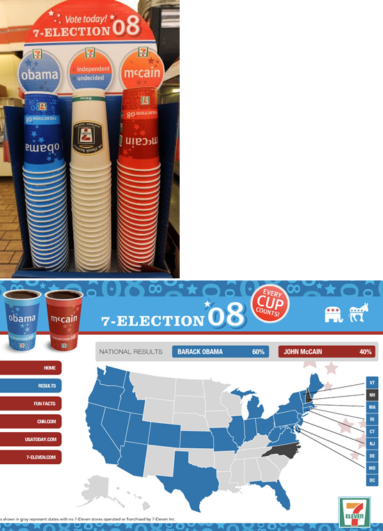 実用的な広告から、ネタっぽいものまで。面白いアイデアが盛り込まれたユニークな屋外広告を集めてみました。トピック:米国大統領選挙(2008年)に便乗したコンビニのアイデア。候補(当時)のコーヒーカップの消費数を支持率として集計したそうです。<米国>