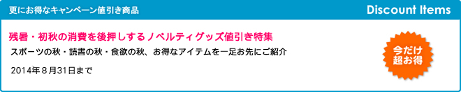 販促ノベルティ卸売りセンターでは、通常の卸売価格よりも更にお得な!値引きキャンペーンを期間限定で開催いたします。是非、お得なこの機会に名入れノベルティをご検討ください。皆様のご利用をお待ちしています。お得な期間は2014年8月31日まで。